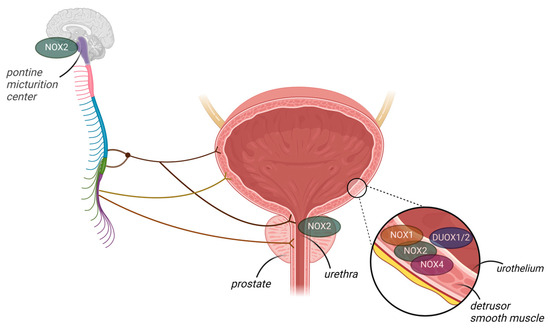 NADPH oxidase (NOX) isoforms identified in the lower urinary tract organs, though their functions remain elusive. NOX2 is expressed in the mouse pontine micturition center (PMC), bladder wall, urethra, and prostate. Additionally, NOX1 and NOX4 are expressed in the bladder wall. DUOX1/2 is present in the mouse urothelium.