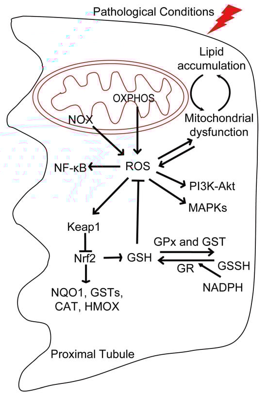 During aerobic metabolic processes such as oxidative phosphorylation (OXPHOS), reactive oxygen species (ROS) are generated by mitochondria as metabolic by-products. Under physiological conditions, ROS are counterbalanced by an antioxidant defense network that modulates ROS levels to enable their physiological roles in cellular signaling pathways and biological processes, including cell metabolism, differentiation, proliferation, angiogenesis, salt and fluid homeostasis, immune response, autophagy, and phosphorylation/dephosphorylation [,,,]. In particular, the kidneys are potentially exposed to high concentrations of oxidants and reactive electrophiles and are highly dependent on an adequate supply of antioxidants to maintain normal function. Reduction–oxidation (redox) imbalance and excess of ROS have detrimental effects on cell structure and function and contribute to intracellular oxidative stress, which results in inflammation, fibrosis, apoptosis, and cell damage in the kidney. Thus, loss of cellular redox homeostasis is a risk factor for the onset and progression of a variety of renal diseases.