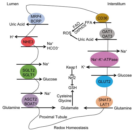 Schematic representation of key molecules involved in renal tubular transport and the redox system under physiological conditions. Under unstressed conditions, CD36 transports free fatty acids (FFAs) into the proximal tubular cells, which are then oxidized by fatty acid oxidation (FAO) and oxidative phosphorylation (OXPHOS) in the mitochondria. This process generates reactive oxygen species (ROS) as by-product. Organic anion transporter 1 (OAT1) and 3 (OAT3) mediate the uptake of uric acid from the blood into tubular cells, which exhibits a pro-oxidant behavior. MRP4 and breast cancer resistance protein (BCRP) are involved in the excretion of uric acid from tubular cells into the lumen of the nephron, thereby reducing intracellular levels of uric acid. Na+-K+-ATPase pumps 3 Na+ out of the cell and 2 K+ into the cell, creating an ion gradient across the cell membrane that drives the reabsorption of glucose and amino acids. Na+/H+ exchanger 3 (NHE3) reabsorbs HCO3− and about 80% of Na+ and also secretes H+. Glucose reabsorption depends mainly on sodium-glucose co-transporter 2 (SGLT2) and sodium-glucose co-transporter 1 (SGLT1). Glucose transporter 2 (GLUT2) mediates glucose transport across the basolateral membrane towards to the plasma. Glutamine is the most abundant amino acid in tubular cells and is reabsorbed through alanine-serine-cysteine transporter-2 (ASCT2) and BOAT1. Sodium-coupled neutral amino acid transporter-3 (SNAT3) and L-type amino acid transporter (LAT1) mediate the glutamine flux from blood to tubular cells. Once inside the cells, glutamine is converted to glutamate and used, along with cysteine and glycine, to produce GSH. GSH is regulated by the master regulator of redox balance, Nrf2, and Nrf2 transcriptional activity is inhibited by its main inhibitor, Keap1.
