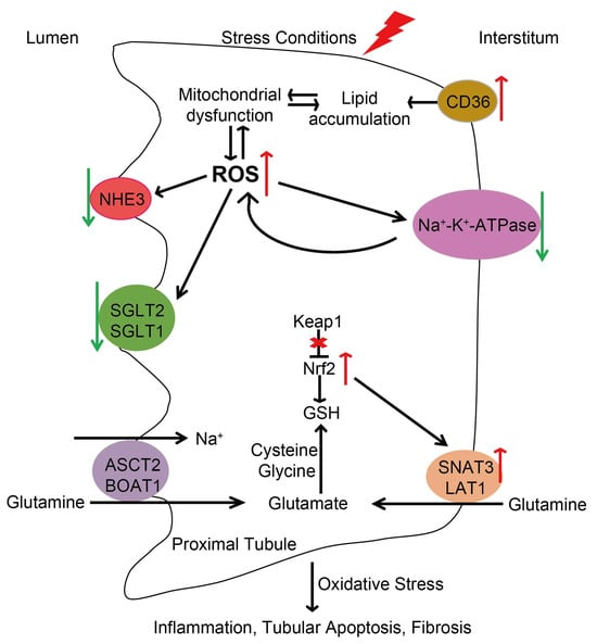 Schematic representation the interplay between key transporters and the redox system under stress conditions. Under stress conditions, CD36 expression is increased and transports more FFA into proximal tubular cells, leading to lipid accumulation and subsequent mitochondrial dysfunction and ROS production. In turn, increased ROS reduce mitochondrial lipid utilization, resulting in lipid accumulation and renal lipotoxicity. Increased ROS oxidize Na+-K+-ATPase subunits and promote Na+-K+-ATPase degradation, which may affect glucose and glutamine reabsorption. However, ROS activate Na+-K+-ATPase signaling pathways, which further increases the generation of mitochondrial ROS generation through the positive-feedback oxidant amplification loop. Oxidative stress inhibits the levels and activity of SGLTs and NHE3 in renal proximal tubule cells. Nrf2 is released from Keap1 and induces the expression of antioxidant genes. Nrf2 upregulates the expression of the glutamine transporter SNAT3 during metabolic acidosis. The effect of Nrf2 on SGLT2 is controversial. Overall, oxidative stress leads to renal inflammation, tubular apoptosis, and fibrosis and contributes to the development and progression of kidney disease. The lightning symbol indicates under stress conditions. The red arrows indicate increased expression, while the green arrows indicate decreased expression. Red “X” indicates prevention of the effect of Keap1 on Nrf2.
