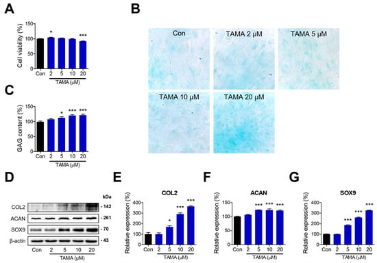 Tamarixetin treatment enhances chondrogenesis in human chondrocytes. (A) Relative cell viability of tamarixetin-treated chondrocytes differentiated from hBMMSC. (B) The GAG content was stained using Alcian Blue and observed using a light microscope (magnification: 400×). (C) The GAG content in chondrocytes increased when treated with tamarixetin. (D–G) Tamarixetin treatment upregulated the levels of chondrogenesis markers. The relative protein expression levels of (E) COL2, (F) ACAN, and (G) SOX9 were evaluated by Western blot. * p < 0.05 and *** p < 0.001, compared with the control group; TAMA: tamarixetin (2, 5, 10, and 20 µM).