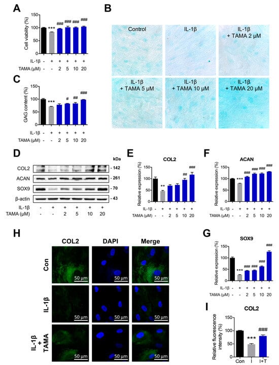 Tamarixetin exhibits chondroprotective effects in an IL-1β-induced OA model. (A) Relative viability of chondrocytes treated with IL-1β, with or without tamarixetin treatment for 48 h. (B,C) The GAG content normalized in IL-1β-treated chondrocytes upon tamarixetin treatment for 48 h (magnification: 400×). (D–G) The effects of tamarixetin on the expressions of chondrogenesis markers in IL-1β-treated chondrocytes. The relative protein expression levels of (E) COL2, (F) ACAN, and (G) SOX9 after 24 h treatment of tamarixetin and/or IL-1β were evaluated by Western blot. (H,I) Immunofluorescence analysis of COL2 expression in chondrocytes under varying treatment conditions. ** p < 0.01 and *** p < 0.001, compared with the control group; # p < 0.05, ## p < 0.01, and ### p < 0.001, compared with the IL-1β-treated group. IL-1β (10 ng/mL); TAMA: tamarixetin (2, 5, 10, and 20 μM); Scale bar: 50 μm.