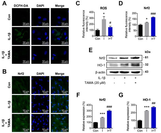 Tamarixetin attenuates IL-1β-induced ROS production by activating the Nrf2/HO-1 signaling pathway in chondrocytes. The cells were treated with tamarixetin for 2 h for the experiments. The relative levels of (A,C) ROS production and (B,D) Nrf2 expression in chondrocytes as evaluated by DCFH-DA and immunofluorescence staining. (E–G) The relative protein expression levels of Nrf2 and HO-1 were evaluated by Western blot. * p < 0.05 and *** p < 0.001 compared with the control group; # p < 0.05, ## p < 0.01, and ### p < 0.001 compared with the IL-1β-treated group. Con: Control; I: IL-1β (10 ng/mL); T: tamarixetin (20 µM); Scale bar: 50 μm.