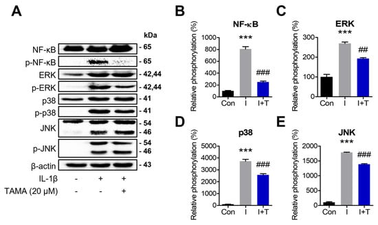 IL-1β rapidly activates the MAPK and NF-κB signaling pathways and contributes to inflammation and ROS production. We investigated whether tamarixetin could inhibit the protein expressions and phosphorylation of NF-κB and MAPKs (including extracellular signal-regulated kinase (ERK), c-Jun N-terminal kinase (JNK), and p38) by Western blot. IL-1β treatment was observed to activate NF-κB and MAPK in chondrocytes, with NF-κB phosphorylation reaching its peak level at 10 min post-treatment and at 20 min post-treatment for ERK and JNK (Figure S2). In the case of p38, it was observed to be highly phosphorylated at 10, 20, and 30 min post-treatment. Therefore, we treated with IL-1β with or without tamarixetin for 10 min to evaluate the activity of NF-κB and for 20 min to assess MAPK activity. IL-1β significantly induced the phosphorylation of NF-κB and MAPK, which was attenuated by tamarixetin treatment (Figure 5). These results indicated that tamarixetin inhibit the activation of NF-κB and MAPK signaling pathways induced by IL-1β in chondrocytes.
