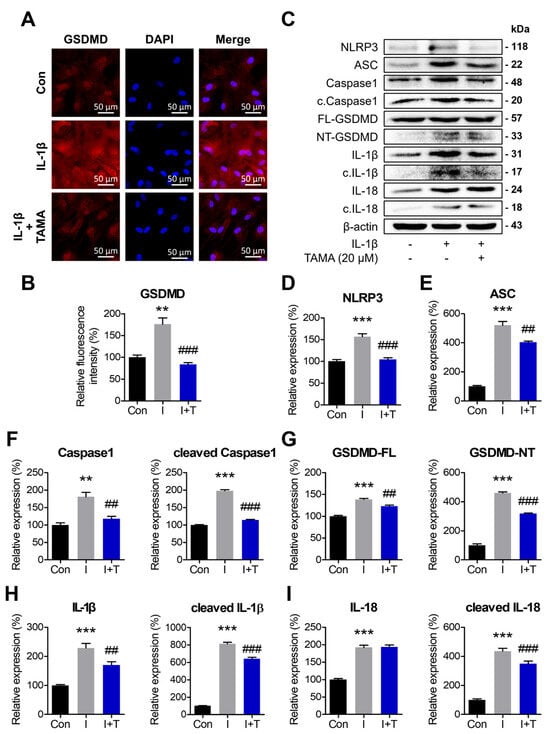 Tamarixetin protects chondrocytes from IL-1β-induced pyroptosis. The cells were treated with tamarixetin for 48 h for all experiments. (A,B) The relative levels of GSDMD in chondrocytes as analyzed by immunofluorescence staining. (C–I) The relative protein expression levels of pyroptosis markers were evaluated by Western blot. ** p < 0.01 and *** p < 0.001, compared with the control group; ## p < 0.01 and ### p < 0.001 compared with the IL-1β-treated group. Con: Control; I: IL-1β (10 ng/mL); TAMA and T: tamarixetin (20 µM); Scale bar: 50 μm.