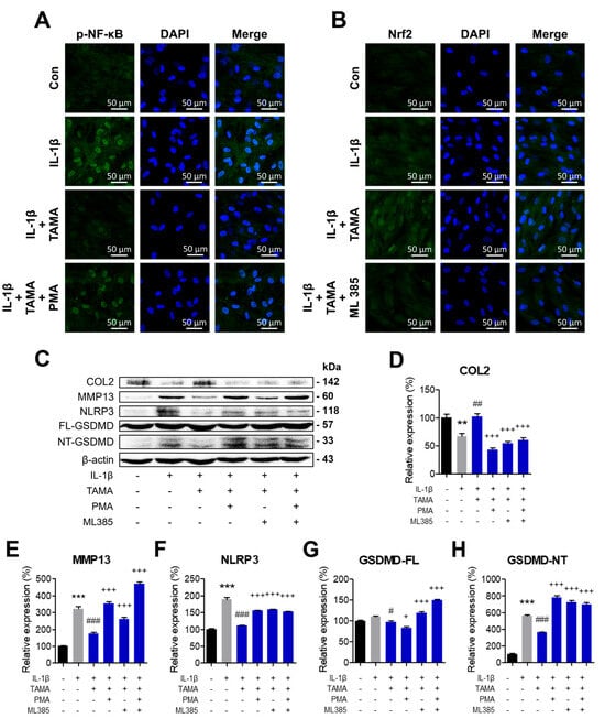 Tamarixetin treatment suppressed pyroptosis and OA progression in an IL-1β-induced OA model by restoring Nrf-2 activity and inhibiting NF-κB activity. (A,B) The relative levels of NF-κB and Nrf2 in chondrocytes under different treatment conditions, as analyzed by immunofluorescence staining. (C–H) The relative protein expression levels of COL2, MMP13, and pyroptosis markers were evaluated by Western blot. ** p < 0.01 and *** p < 0.001, compared with the control group; # p < 0.05, ## p < 0.01, and ### p < 0.001 compared with the IL-1β-treated group; + p < 0.05 and +++ p < 0.001 compared with the IL-1β/tamarixetin co-treated group. Con: Control; I: IL-1β (10 ng/mL); TAMA: tamarixetin (20 µM).