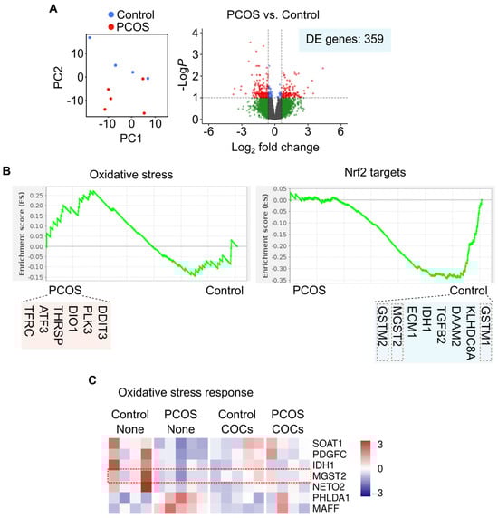 Transcriptomic profiles of PBMCs from control women differed from those of women with PCOS, showing differential expression of 359 genes (Figure 1A). Genes differentially expressed were enriched in functions related to inflammation and, interestingly, oxidative stress response. The latter has been associated with PCOS and its metabolic phenotypes. Next, we used GSEA to analyze the association of PCOS with the expression of genes involved in the oxidative stress response beyond differential expression. We observed an association between PCOS samples and the expression of oxidative-stress-responsive genes, with a robust inverse association observed between the PCOS condition and genes regulated directly by Nrf2 (Figure 1B). Moreover, women with PCOS showed lower expression of several enzymes with glutathione transferase activity of the microsomal class (Figure 1B).