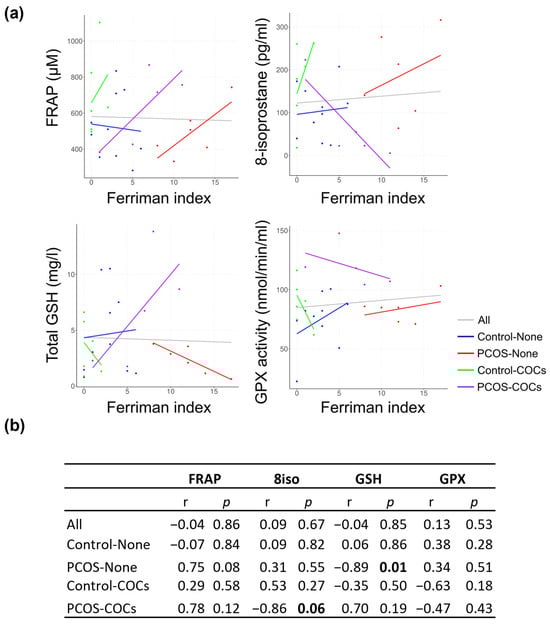 We determined the correlation of the Ferriman index with the parameters of interest in our cohort, either in all samples or in each of the groups separately (Figure 5). When considering all samples together, there was no correlation between the Ferriman index and any of the parameters evaluated (Figure 5, gray lines). Notably, by analyzing correlations separately in women with or without PCOS who used oral contraceptives, we observed significant correlations between the Ferriman score and some parameters related to oxidative stress. For FRAP, a positive trend in the correlation with the Ferriman index was observed in the PCOS group (red line) (r = 0.75, p = 0.08). Consistently with the results in Figure 3b, we observed opposite correlations in the levels of 8-isoprostane and in the Ferriman score in women with PCOS who did not use oral contraceptives (red lines; r = 0.31, p = 0.5) compared to those who used contraceptives (purple lines; r = −0.86, p = 0.06). Notably, an opposite correlation was also observed in these groups for total GSH and the Ferriman score: a negative correlation was observed in women with PCOS who did not use oral contraceptives (red line; r = −0.89, p = 0.01), whereas there was a positive correlation in women with PCOS who used oral contraceptives.