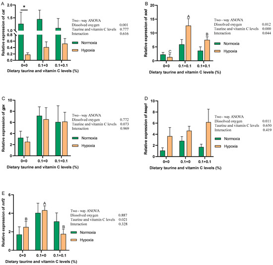 Relative expression levels of mRNA of antioxidant-related genes of gibel carp fed graded dietary of taurine and vitamin C in normoxia for 8 weeks and hypoxia for 12 h. Data with different superscript letters are significantly different (p < 0.05); the hypoxic data were labeled with an upper case “ABC”, “*” indicates a significant difference (p < 0.05) between values of 0.8 mg/L and 6.5 mg/L dissolved oxygen as determined by t-test. (A) cat, catalase; (B) sod, superoxide dismutase; (C) gpx, glutathione peroxidase; (D) keap1, recombinant kelch-like ECH-associated protein 1; (E) nrf2, nuclear factor erythroid 2-related factor 2.
