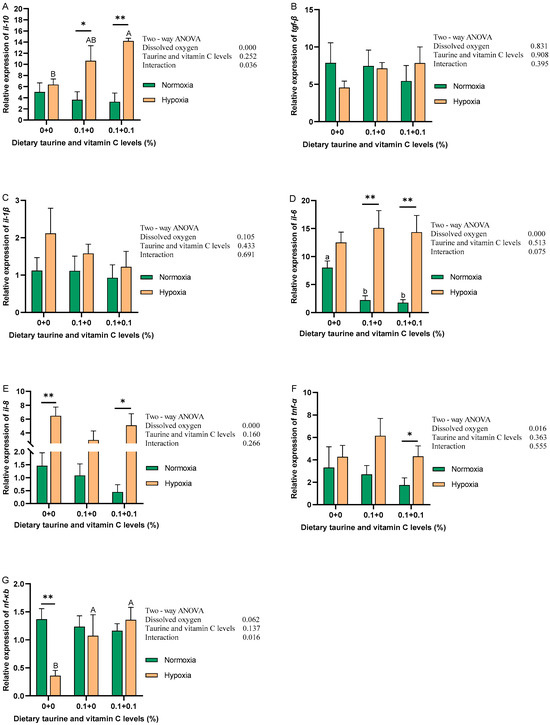Relative expression levels of mRNA of hepatic inflammation-associated genes of gibel carp fed graded dietary of taurine and vitamin C in normoxia for 8 weeks and hypoxia for 12 h. Data with different superscript letters are significantly different (p < 0.05); the normoxic data were labeled with a lower case “ab” and the hypoxic data were labeled with an upper case “AB”, “*” indicates a significant difference (p < 0.05) and “**” indicates a significant difference (p < 0.01) between values of 0.8 mg/L and 6.5 mg/L dissolved oxygen as determined by t-test. (A) il-10, interleukin-10; (B) tgf-β, transforming growth factor-β; (C) il-1β, interleukin-1β; (D) il-6, interleukin-6; (E) il-8, interleukin-8; (F) tnf-α, tumor necrosis factor-α; (G) nf-κb, nuclear factor kappa-β.