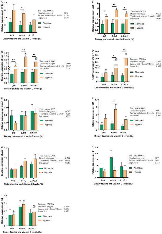 Relative expression levels of mRNA of hypoxia genes of gibel carp fed graded dietary of taurine and vitamin C in normoxia for 8 weeks and hypoxia for 12 h. Data with different superscript letters are significantly different (p < 0.05); the hypoxic data were labeled with an upper case “AB”, “*” indicates a significant difference (p < 0.05) and “**” indicates a significant difference (p < 0.01) between values of 0.8 mg/L and 6.5 mg/L dissolved oxygen as determined by t-test. (A) hif-1α, hypoxia-inducible factor 1-α; (B) vegf, vascular endothelial growth factor; (C) epo, erythropoietin; (D) ho-1, heme oxygenase-1; (E) angpt1, angiopoietin-1; (F) et1, endothelin 1; (G) nos, nitric oxide synthase; (H) tf, transferrin; (I) tfr1, transferrin receptor protein 1.