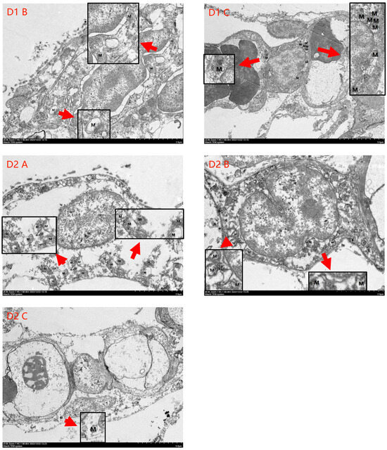 Transmission electron microscopy results of gibel carp gill cells in each group in hypoxia. Note: “D0/D1/D2” denote the three treatment groups, and “A/B/C” represent three samples from the same treatment group. “M” indicates the location and number of mitochondria.