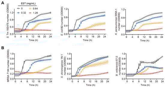 Antibacterial activities of EST on diverse pathogenic bacteria. (A) Growth curves of S. Tm, E. coli, and K. pneumonia with EST supplementation. (B) Growth curves of MRSA, S. chromogenes, and B. velezensis with EST supplementation.