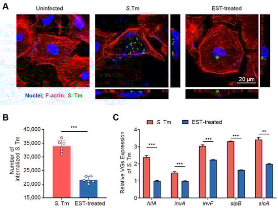 EST reduces the invasion of S. Tm into intestinal epithelial cells. (A) Confocal images showing internalized S. Tm 15E475 (green) in IEC-6 cells. The 3D images were acquired using confocal laser scanning microscopy (CLSM), where F-actin was visualized with rhodamine phalloidin (red) and nuclei with DAPI (blue). (B) The number of internalized S. Tm 15E475 in IEC-6 cells with or without EST treatment. (C) Relative expression of virulence genes (VGs) of S. Tm 15E475 with or without EST treatment. Results represent the mean ± standard error. p values were calculated using independent-samples t-tests. ** p ≤ 0.01; *** p ≤ 0.001.