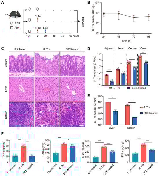 EST decreases S. Tm loads and disease severity in infected mice. (A) Experimental design for the establishment of S. Tm-infected and EST-treated mouse models. (B) S. Tm shedding in feces of mice for 96 h. (C) Representative H&E staining images of the cecum, liver, and spleen in uninfected, S. Tm-infected, and EST-treated mice. (D) S. Tm loads in the jejunum, ileum, cecum, and colon. (E) S. Tm loads in the liver and spleen. (F) Inflammatory cytokine levels in the cecum. Results represent the mean ± standard error. p values were calculated using independent-samples t-tests (D,E) or one-way ANOVA followed by Fisher’s LSD post hoc tests (F). * p ≤ 0.05; ** p ≤ 0.01; *** p ≤ 0.001.