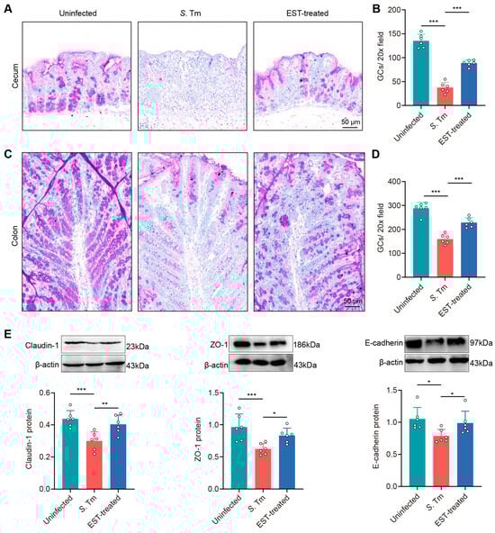 To investigate whether EST treatment augments intestinal mucosal integrity in S. Tm-infected mice, we examined changes in goblet cell count and the expression of tight junction proteins in mucosal epithelium. PAS staining images showed a pronounced decrease in goblet cell numbers in the cecum and colon of S. Tm-infected mice compared with uninfected mice by 262.1% (p < 0.001) and 80.9% (p < 0.001), respectively. In contrast, EST supplementation significantly elevated these values (Figure 6A–D).