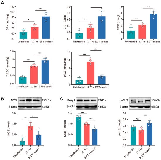EST ameliorates S. Tm-induced intestinal oxidative injury via activating the Nrf2 pathway. (A) Concentrations of antioxidant enzymes (GPx, CAT and SOD), T-AOC and MDA in the cecum (n = 6). (B,C) Cecal iNOS (B), Keap1 and p-Nrf2 (C) protein expression in uninfected, S. Tm and EST-treated groups. Relative protein levels were normalized to β-actin (n = 6). Results represent the mean ± standard error of the mean. p-values were calculated using one-way ANOVA followed by Fisher’s LSD post hoc tests. * p ≤ 0.05; *** p ≤ 0.001; ns, not significant.