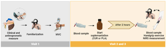 The study was randomized, crossover, placebo-controlled, and double-blind. All individuals came to the laboratory three times with 1-week intervals between visits. Participants were instructed to fast for at least 8 h, avoid nitrate-rich food, caffeine, vitamin and mineral supplements, alcohol intake, and physical exercise for at least 12 h before the testing visits. On the first visit, the participants’ clinical and anthropometric data were collected, and they were familiarized with the exercise protocol. In visits 2 and 3, after a 10-min period of quiet rest, the participants ingested 10 g of turmeric root extract from Curcuma longa L. (CUR) (containing 95.33% of the total curcuminoids) as a dietary source of curcumin, dissolved in 400 mL of water, or the same amount of corn starch as placebo (PLA). After 2 h of treatment intake, the exercise protocol was started, and NIRS parameters were evaluated (Figure 1). The beverages were offered in an amber bottle to blind the participant to know what condition (i.e., curcumin or placebo condition) they were in. A laboratory member not directly involved in the present study conducted and completed the randomization of the participants and blinding of the study. First, treatments A and B were coded as curcumin or placebo by tossing a coin. Then, curcumin and placebo drinks were portioned in amber bottles with similar appearance and consecutively numbered for each participant according to the randomization schedule. Each participant was assigned an order number and received the intervention in the corresponding bottle. Both the participants and the investigators were blinded to the treatment order. We chose to provide 10 g of turmeric root extract since such a dose is well tolerated when consumed orally and has been reported to improve cerebral oxygenation in older people [19].