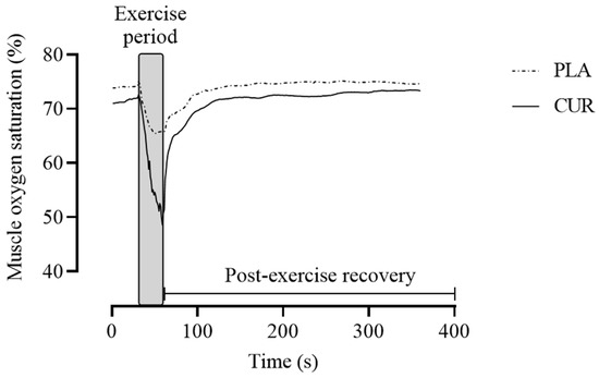 Representative profile of NIRS-derived measure of muscle oxygen saturation (SmO2) during the handgrip exercise protocol in both curcumin (CUR) and placebo (PLA) conditions.