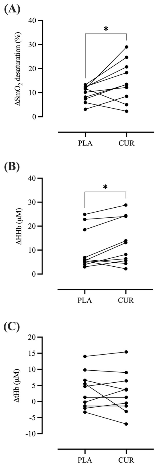 Changes in muscle oxygen desaturation (ΔSmO2) (A), amplitude of deoxyhemoglobin (ΔHHb) (B), and amplitude of total hemoglobin (ΔtHb) (C) during dynamic handgrip exercise in both curcumin (CUR) and placebo (PLA) conditions. The symbol * denotes significantly different from PLA (p < 0.05).