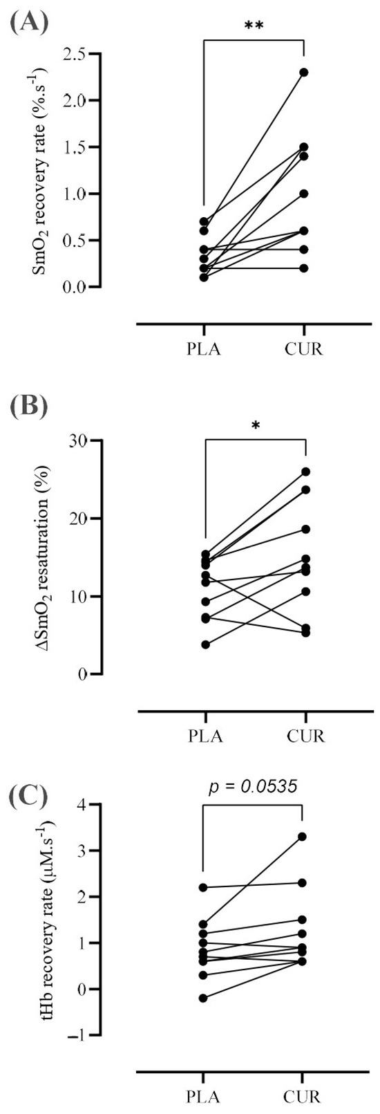 Changes in the muscle oxygen saturation (SmO2) recovery rate (A), the amplitude of muscle oxygen resaturation (ΔSmO2) (B), and total hemoglobin (tHb) recovery rate (C) after dynamic exercise in both curcumin (CUR) and placebo (PLA) conditions. The symbol * denotes significantly different from PLA (p < 0.05) and ** (p < 0.001).