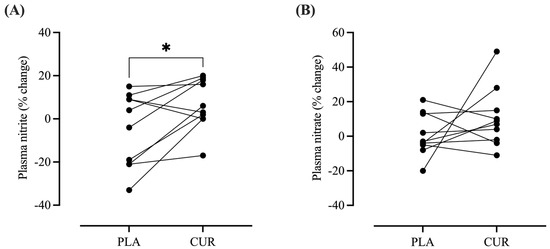A significantly higher percentage change from pre-supplementation for plasma nitrite (nitrite) was found for CUR compared to PLA (CUR: 6.82 ± 11.68 vs. PLA: −4.94 ± 17.28%, p = 0.028, d = 0.77; Figure 5). There were no significant differences between CUR and PLA for plasma nitrate (CUR: 10.5 ± 17.11 vs. PLA: 0.71 ± 12.11%, p = 0.244, d = 0.64; Figure 5). Absolute values for plasma nitrate and nitrite are presented in Table 2.