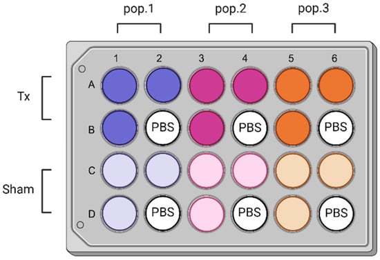 Twenty-four well plates (one per wavelength) were used to assess the effects of light exposure on different cell populations (pop. 1 (purple shades), 2 (magenta shades), and 3 (orange shades)) at an intensity of 20 mW/cm2 and a dosage of 15 J/cm2. Each column represents a specific cell population, including the treated groups (Tx) in darker shades and sham groups in lighter shades. The top two rows (A,B) are for the treated groups, while the bottom two rows (C,D) are for the sham groups. The wells labeled with “PBS” (B2, B4, B6, D2, D4, D6) serve as blank controls, which stands for phosphate-buffered saline. The blank control wells were used to account for any background signal or non-specific effects unrelated to light treatment. Aluminum tape was affixed underneath the sham wells to avoid any light exposure during the treatment. Each experiment was conducted in triplicate for each cell type (N = 3, n = 3), with a week interval between replicates. Figure 1 was sketched using BioRender (Toronto, ON, Canada).