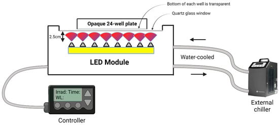 A custom-made LED module was employed in this study. This water-cooled LED module consisted of 16 LEDs per selected wavelength, totaling 48 LEDs and irradiating in the blue (λpeak = 455 nm), red (λpeak = 660 nm), and NIR (λpeak = 850 nm) spectra.