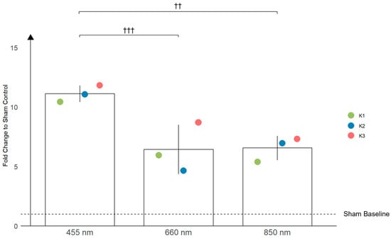 The bar graph illustrates the effects of three different wavelengths of light (455 nm, 660 nm, and 850 nm) on the production of nitric oxide (NO) in primary human keratinocytes. The data represent the mean NO production across three different donor populations (K1, K2, K3), with their respective standard deviation (SD). The fold increase in NO production is shown relative to the sham-treated controls. Statistically significant differences are indicated with crosses, with †† p < 0.01, and ††† p < 0.001. Significant differences were observed between 455 nm and 660 nm, as well as between 455 nm and 850 nm.