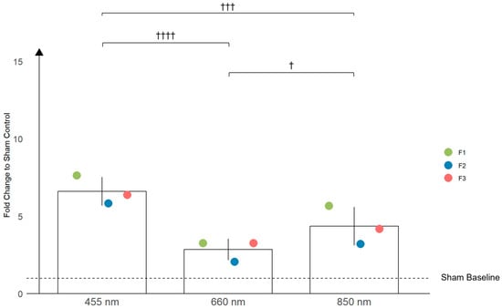 The bar graph illustrates the effects of three different wavelengths of light (455 nm, 660 nm, and 850 nm) on the production of nitric oxide (NO) in primary fibroblasts from three different patients: F1, F2, and F3. The fold increase in NO production is shown relative to the sham-treated controls. Each bar represents the mean ± standard deviation (SD) across the different populations. Statistically significant differences between the different light treatments are indicated with crosses †, with † p < 0.05, ††† p < 0.001, and †††† p < 0.0001.