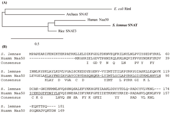 Analysis using BLASTp (http://www.ncbi.nlm.nih.gov/, accessed on 26 August 2019) indicated that human Naa50 harboring SNAT enzyme activity [18] exhibited ~38% identity to a putative SNAT protein of S. lemnae consisting of 181 amino acids (aa) with 83% query cover value. Phylogenetic analysis indicated that the putative S. lemnae SNAT (SlSNAT) protein was the closest orthologue of human Naa50 belonging to the archaeal SNAT clade (Figure 1A). The two protein sequences were aligned using BLASTp, revealing that SlSNAT had 38% aa identity to human Naa50 (Figure 1B). The putative SlSNAT was annotated as a member of the protein NAT family carrying a region with identity to E. coli RimI, ranging in size from 40 to 176 aa. It was recently reported that RimI, an N-terminal protein acetyltransferase, also exhibited SNAT enzyme activity [21]. Taken together, the results of these in silico analyses suggested that the putative SlSNAT may exhibit SNAT enzyme activity.