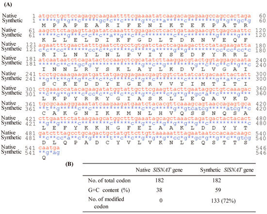 (A) Nucleotide alignment between native (red; CDW73552) and synthetic (blue) S. lemnae SNAT. Identity is denoted by stars. Black letters, amino acids. (B) Modification of S. lemnae SNAT codons. The nucleotide sequence of synthetic S. lemnae SNAT was manually codon optimized with reference to the rice SNAT2 codon.