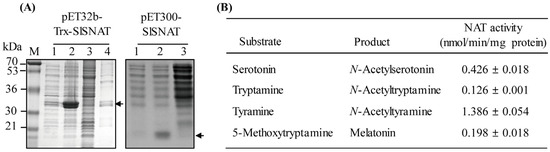 Escherichia coli expression, affinity purification of SlSNAT recombinant protein, and its enzymatic characteristics. (A) Expression of SlSNAT as a thioredoxin (Trx) fusion protein using a pET32b vector and expression of SlSNAT as an N-terminal His × 6-tagged SlSNAT protein using a pET300 vector. (B) Serotonin N-acetyltransferase enzyme activity (SNAT) as a function of various substrates. The expression of recombinant SlSNAT protein is marked by arrows.