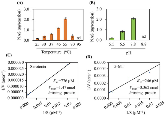 SNAT enzyme kinetic analysis. Serotonin N-acetyltransferase enzyme activity as a function of (A) various temperature, (B) various pH, (C) Km and Vmax values for serotonin substrate, (D) Km and Vmax values for 5-methoxytryptamine (5-MT) substrate. Values are means ± SD (n = 3). nd, not detectable.