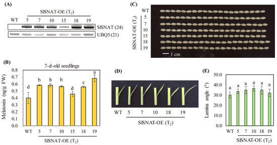 To determine whether SlSNAT overexpression was functionally associated with melatonin synthesis, the levels of melatonin were measured in 7-day-old seedlings of SlSNAT-OE lines. As shown in Figure 5B, all transgenic lines (with the exception of line 15) produced higher levels of melatonin than wild-type control, indicating a positive correlation between SlSNAT mRNA expression and melatonin level. It was previously reported that rice SNAT2 downregulation resulted in short grains, in conjunction with a decrease in brassinosteroid (BR) level [31]. As a simple phenotypic test for increased BR level, grain length was first monitored in the SlSNAT-OE lines. As shown in Figure 5C, some transgenic lines (e.g., lines 7, 18, and 19) exhibited a slight increase in grain length, whereas other lines (e.g., lines 5, 10, and 15) showed similar grain length to the wild-type control. These results indicated that BR levels were not significantly increased in the SlSNAT-OE lines relative to the wild type. Lamina angle (the angle between the second leaf blade and vertical culm) was monitored as another BR indicator because BR plays a key role in lamina angle increase. As shown in Figure 5D,E, the lamina angles of the SlSNAT-OE lines were comparable to those of wild-type controls, indicating that BR levels were not elevated in the SlSNAT-OE lines; this finding was similar to previous results from transgenic rice plants overexpressing rice SNAT2 [31]. Taken together, these observations indicated that an endogenous melatonin increase is not necessarily coupled to an increase in BR.