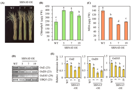 Enhanced senescence tolerance in SlSNAT-overexpressing transgenic rice plants. (A) Photograph of senescence-treated 5-week-old rice leaves. (B) Chlorophyll contents in senescence-treated rice leaves. (C) Malondialdehyde (MDA) contents. (D) Gene expression profiles of senescence marker genes by RT-PCR. (E) Gene expression profiles of senescence marker genes by quantitative RT-PCR. Fourth and fifth leaves from 5-week-old rice plants grown in soil pots were detached and this was followed by senescence treatment for 12 days. WT, wild type; UBQ5, rice ubiquitin 5 gene. GenBank accession numbers are Osl2 (AF251073), Osl20 (AF251067), Osl185 (AF251075), and UBQ5 (AK061988). Different letters indicate significant differences among the lines (Tukey’s HSD; p < 0.05).