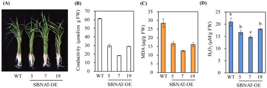Enhanced tolerance of SlSNAT-overexpressing transgenic rice plants against peroxidizing herbicide butafenacil. (A) Photograph of rice seedlings after butafenacil treatment. (B) Effect of butafenacil treatment on cellular leakage. (C) MDA production from butafenacil-treated rice seedlings. (D) H2O2 content from butafenacil-treated rice seedlings. Seven-day-old rice seedlings were challenged with 0.1 µM butafenacil for 48 h. WT, wild type; FW, fresh weight. Different letters indicate significant differences among the lines (Tukey’s HSD; p < 0.05).