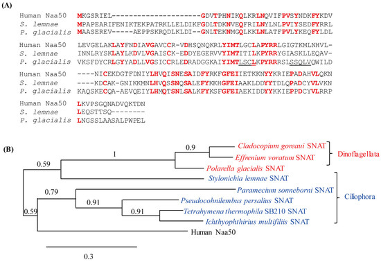 Sequence comparison and phylogenetic tree of SNAT in the Ciliophora and dinoflagellates. (A) Consensus amino acid sequences among three SNAT proteins including the human Naa50, the ciliate Stylonichia lemnae SNAT, and the dinoflagellate Polarella glacialis SNAT. Bold red letters indicate consensus amino acids. Dashes denote gaps for maximizing alignment of conserved residues. A coenzyme-A-binding pocket is underlined. (B) Phylogenetic tree analysis of SNAT proteins from the ciliates and dinoflagellates. GenBank accession numbers of various SNAT genes are as follows: human Naa50 (BAB14397), Cladocopium goreaui (CAI3999280); Effrenium voratum (CAJ1361560); Polarella glacialis (CAK0876941); Stylonichia lemna (CCKQ01002460); Paramecium sonneborni (CAD8056267); Pseudocohnilembus persalius (KRX00195); Tetrahymena thermophila SB210 (XP_001025216); Ichthyophthirius multifiliis (XP-004035125). The scale bar represents 0.3 substitutions per site.