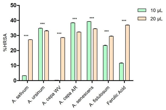 Hydroxyl radical scavenging activity (%HRSA) by Allium extracts at two different volumes: 10 μL and 20 μL. 1. A. sativum, 2. A. ursinum, 3. white variety of A. cepa, 4. Arieș red cultivar of A. cepa, 5. A. senescens subsp. montanum, 6. A. fistulosum, and 7. Ferulic acid; *** p < 0.001, according to the two-way ANOVA and Bonferroni’s post-test.