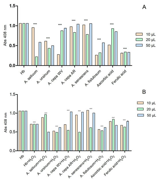 The interactions of the extracts with hemoglobin (A) and with hemoglobin after adding 6 μL of H2O2 (B); in the presence of hydrogen peroxide, hemoglobin may exhibit a catalase-like function, breaking down H2O2 into water and oxygen, which prevents further oxidative damage. These reactions apparently suggested that hydrogen peroxide plays an antioxidant function; ascorbic and ferulic acid were used as antioxidant standards. *** p < 0.001 (A), ### p < 0.001 (B) according to two-way ANOVA and Bonferroni’s post-test.