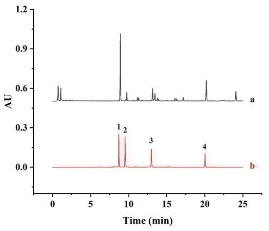 Chromatograms of samples (a) and mixed standards (b) (1 for Amentoflavone (AMF), 2 for Robustaflavone (ROF), 3 for Hinokiflavone (HIF), 4 for Heveaflavone (HEF)).