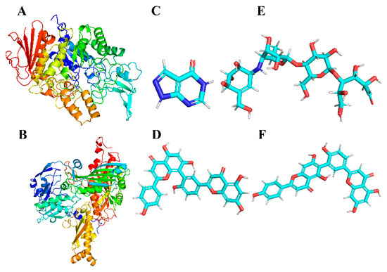 Three-dimensional structures of the proteins (represented by a cartoon model) α-glucosidase (A) and XOD (B); three-dimensional structures of small-molecule ligands allopurinol (C), AMF (D), acarbose (E) and ROF (F).