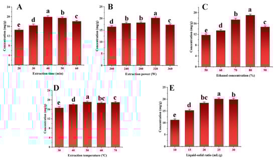 Effects of extraction time (A), extraction power (B), extraction concentration (C), extraction temperature (D) and liquid-solid ratio (E) on the total biflavonoids from Selaginella doederleinii.
