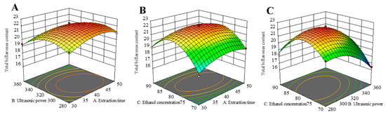 Response surface plots and contour plots show the effect of (A) extraction time and ultrasonic power, (B) extraction time and ethanol concentration, and (C) ultrasonic power and ethanol concentration on response of the total biflavonoids from Selaginella doederleinii.
