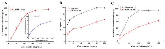 With a small modification, the method of Rodríguez et al. [41] was employed to assess the inhibitory activity of SD extracts against α-glucosidase within a concentration range of 10–150 μg/mL. The IC50 values were subsequently computed. The principle is that p-nitrophenyl-α-d-glucopyranoside (PNPG) used as a substrate is converted into yellow p-nitrophenol (PNP) and glucose by α-glucosidase, and PNP exhibiting maximum absorption at 405 nm. The specific procedure is shown in Table 2.