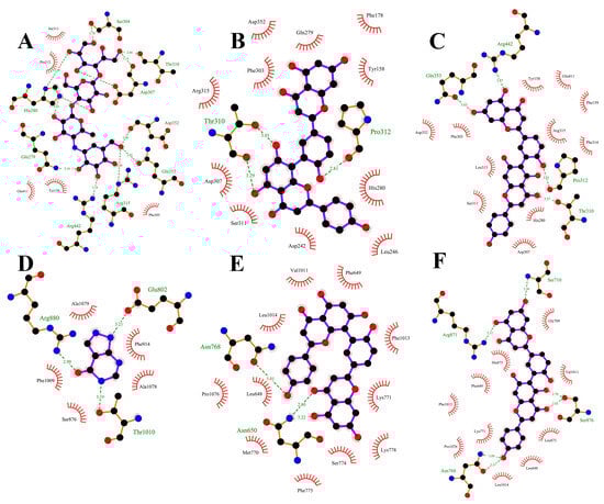 Docking was performed using AutoDock 4.2 [46], with the center coordinates of the docking box set at the known structural domain of the protein. With the grid point size set to 0.375 Å, all potential amino acid that could bind were included. The default values were applied to the remaining parameters. Docking was executed, and the 10 highest-scoring docked structures were provided for each dock. The lowest-scoring small molecule that located within the structural domain was selected for analysis. Ligand–protein interactions were using Ligplot 2.2.8 [47] software and visualization views were drawn by PyMOL 2.5.0.