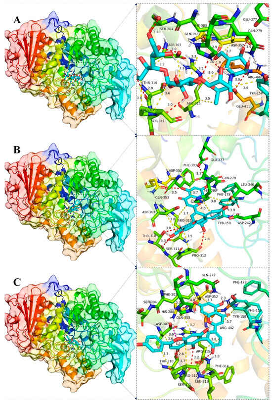 Protein information for AG (PDB ID:3A4A) and XOD (PDB ID:3NVY) was extracted from the PDB database (https://www.rcsb.org/, accessed on 7 March 2024). The pdb structures were downloaded to serve as the initial structure of the protein receptor and residue complementation was performed. The ligand small molecule in mol format was converted into a 3D molecular structure by OpenBabel.2.3.1 [44] software. The MMFF94 force field was applied to optimize the 3D structures of small molecules. Ultimately, the initial receptor and ligand structures were processed, hydrogenation was performed, charges were calculated and saved, docking atom types were assigned and pdbqt files were generated for docking using AutoDock Tools 1.5.6 [45]. The ligand and receptor structures are shown in Figure 2.