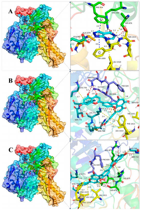 To further investigate the interactions and stability of the complex, molecular dynamics (MD) simulations were conducted using GROMACS 2022.3 to simulate the protein–ligand complex for 50 ns [48]. The AMBER99SB-ILDN force field was selected to generate the protein topology, while the ligand topology was generated using the GAFF force field through the Amber20 software [49]. A truncated octahedral TIP3P water box was added around the system maintaining a distance of 10 nm, and Na+/Cl− ions were included to neutralize the system [50]. Energy minimization was performed using 2500 steps of the steepest descent method followed by 2500 steps of the conjugate gradient method. Subsequently, an NVT ensemble simulation for 100 ps and an NPT equilibrium simulation for 100 ps were conducted out at a constant temperature of 298.15 K [51]. Finally, a 50 ns MD ensemble simulation was performed under periodic boundary conditions, with long-range electrostatic interactions calculated using the Particle Mesh Ewald (PME) method, a non-bonded cutoff distance of 1 nm, a collision frequency of 2 ps, a system pressure of 101.325 kPa and a time step of 2 fs. Trajectories were saved every 10 ps [52].