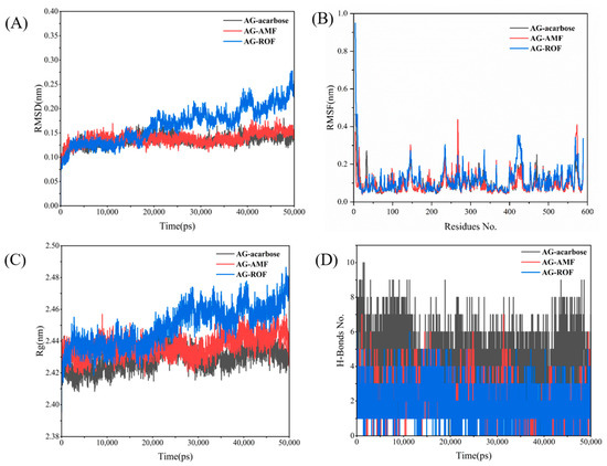 AG MD results: (A) RMSD; (B) RMSF; (C) Rg; (D) H-bonds.