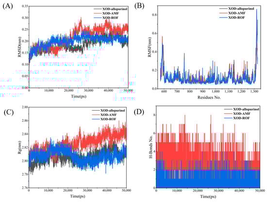 By monitoring the stability of allopurinol in the active site, snapshots were extracted at different times during the simulation as shown in Figure S1, where allopurinol remained in the active pocket throughout the simulation, indicating that allopurinol was able to bind well to the protein XOD. Figure 11A presents the RMSD changes for the XOD complexes with the three ligands. The RMSD of the XOD–allopurinol complex remains between 0.15 and 0.2 nm throughout the simulation, with minimal fluctuations, indicating a stable structure. The XOD–AMF complex shows a significant increase in RMSD in the later stages of the simulation, indicating substantial conformational changes. The XOD–ROF complex remains relatively stable for most of the simulation. Figure 11B shows that the XOD–AMF and XOD–ROF complexes exhibit significant residue fluctuations, especially towards the C-terminal region (around residue 1300), indicating greater flexibility. In contrast, the XOD–allopurinol complex shows smaller residue fluctuations, reflecting a higher local stability. Figure 11C demonstrates that the Rg value of the XOD–allopurinol complex remains around 2.80 nm with minimal fluctuations, indicating a compact and stable structure. The Rg value of the XOD–AMF complex is significantly higher and more variable, especially towards the end of the simulation, suggesting that the structure becomes increasingly relaxed. The Rg value of the XOD–ROF complex lies between the other two, showing moderate compactness. Finally, Figure 11D illustrates the changes in hydrogen bond numbers over time, reflecting the interaction strength of the complexes. The XOD–AMF complex has the most hydrogen bonds and is relatively stable, indicating strong interactions between AMF and XOD. The XOD–allopurinol complex has fewer hydrogen bonds but maintains reasonable stability. The XOD–ROF complex has the fewest hydrogen bonds, with noticeable fluctuations, suggesting weaker interactions between ROF and XOD.